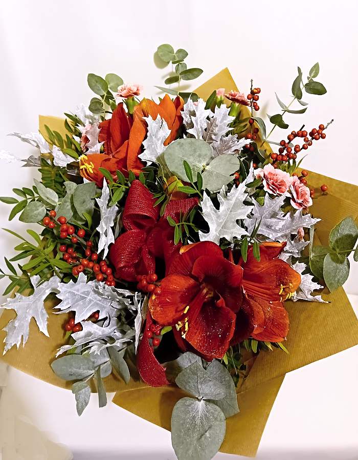 nádherná sváteční kytice ze zimních obřích květů amarylisu s doplňky